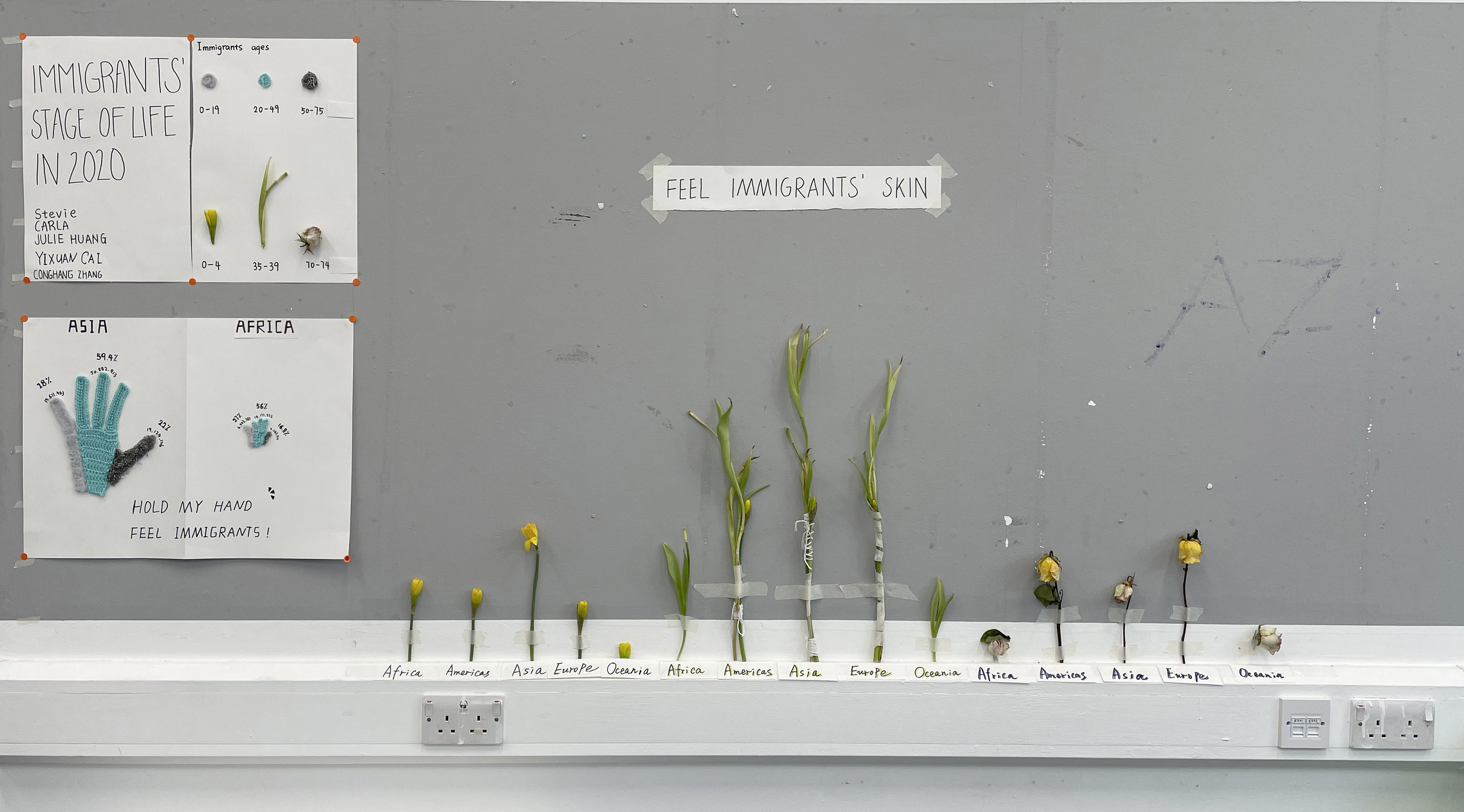 The flowers, their blossom and wither asa metaphor for the stagesof life and the different age ranges for immigration.